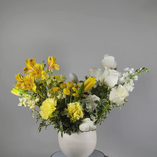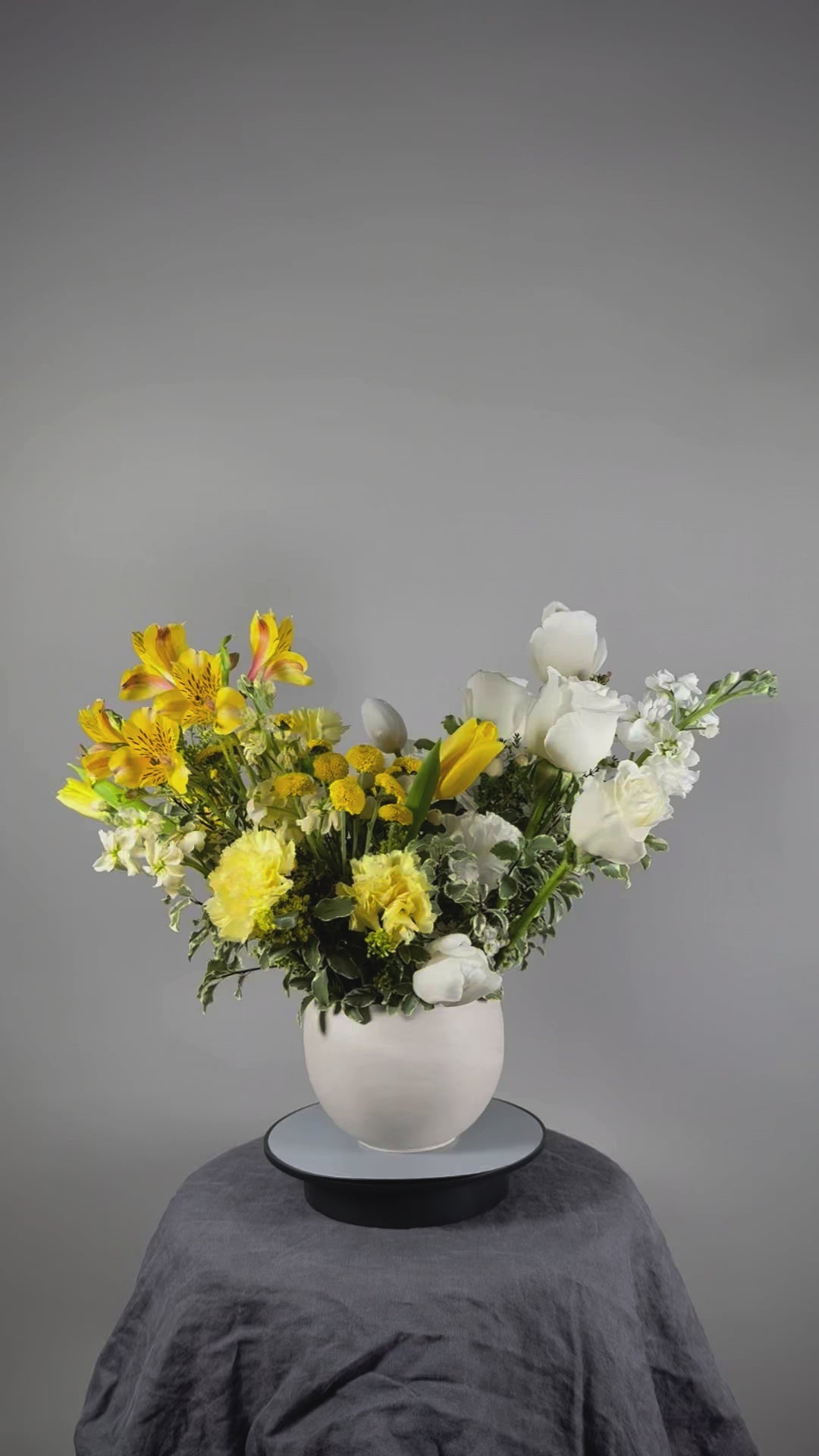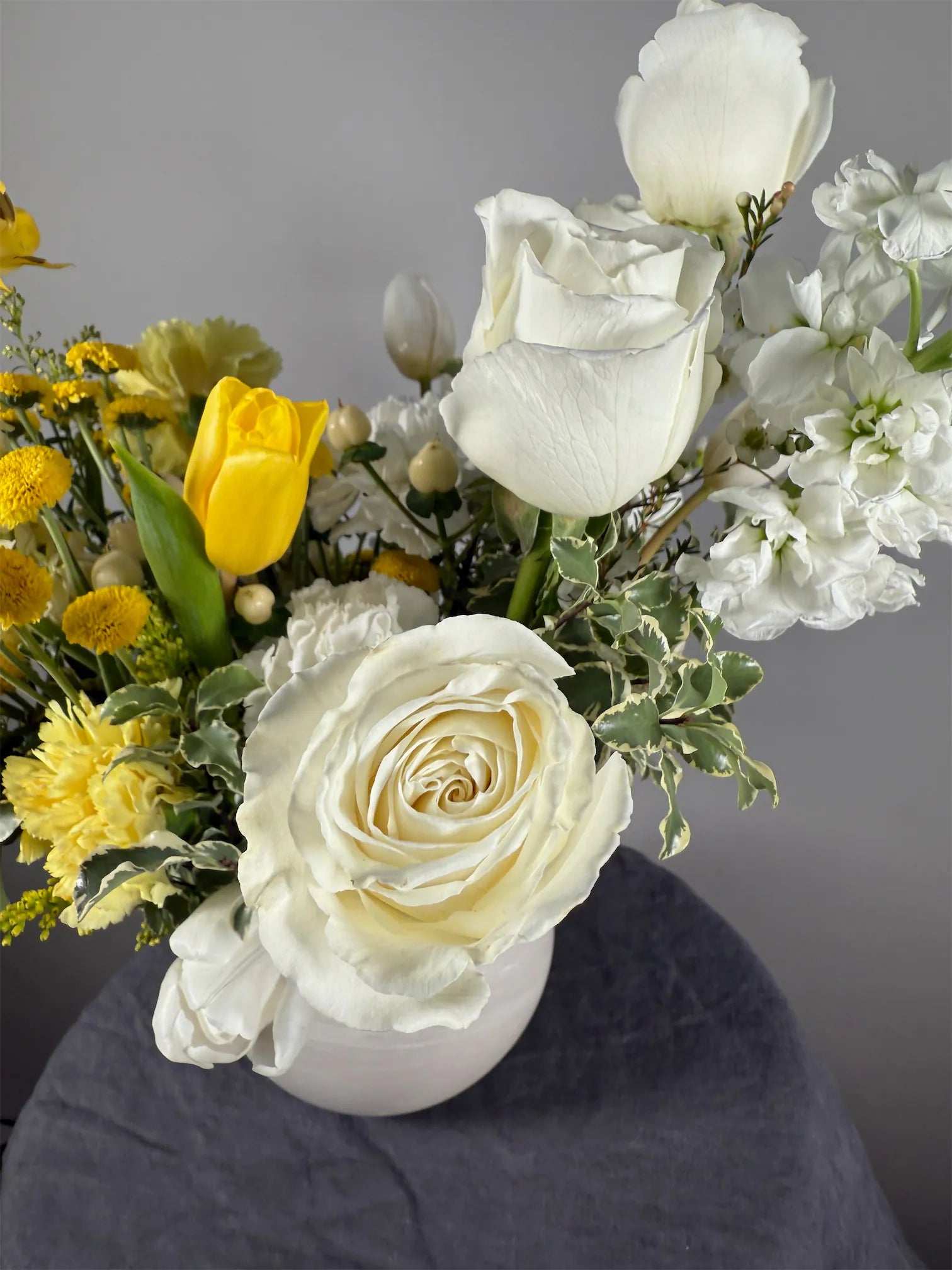 This cheerful vase arrangement brings warmth and brightness with a sunny mix of yellow and white blooms. It features roses, chrysanthemums, carnations, stock flowers, and fresh foliage, all arranged in a modern round ceramic vase.