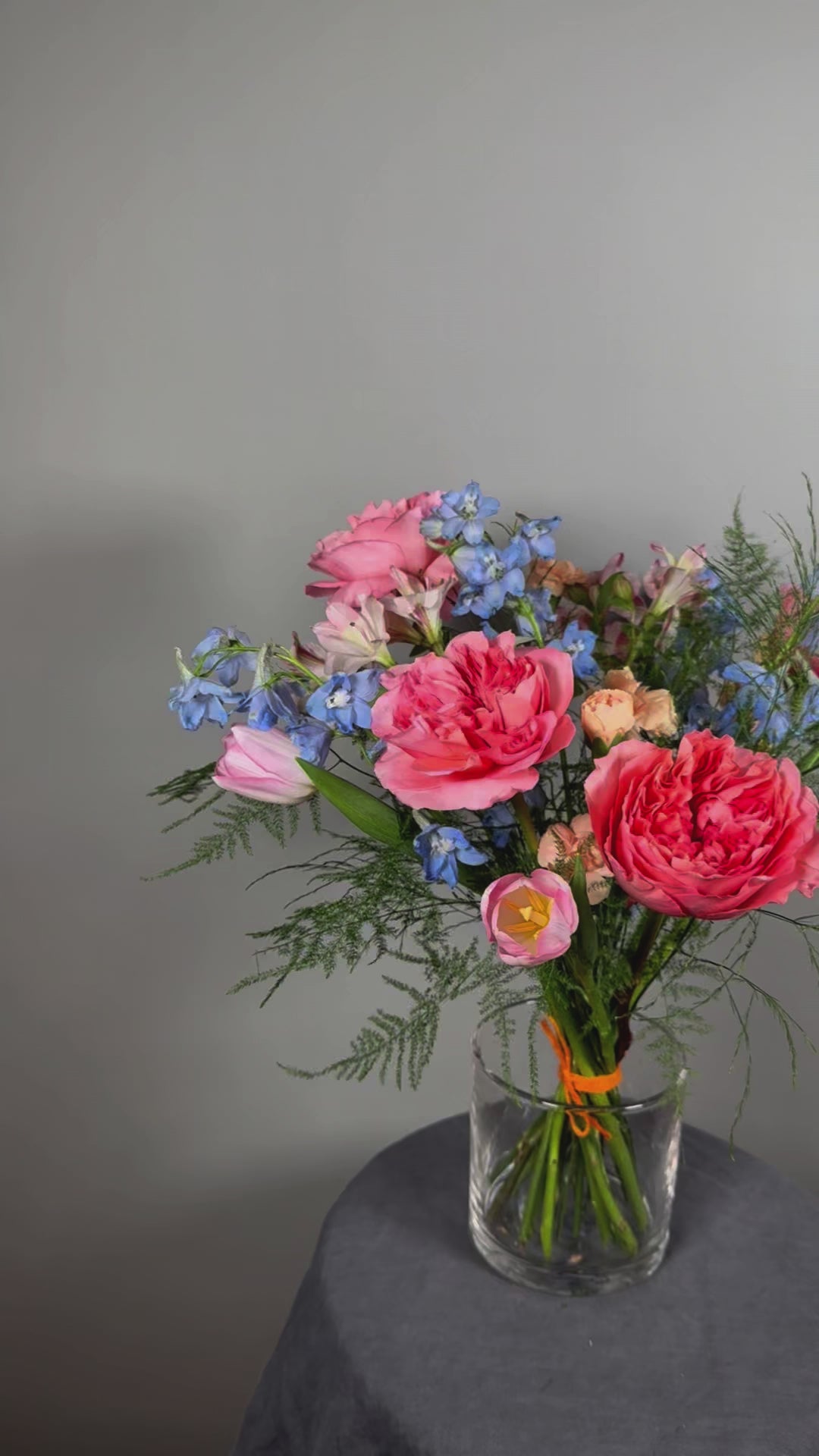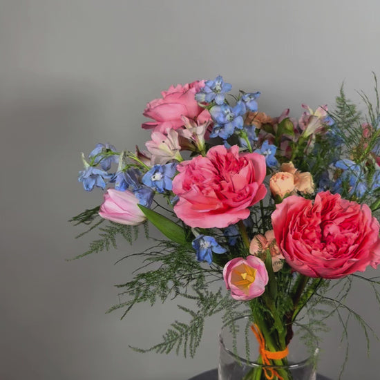 A delicate gathering of pink roses, peach baby carnations, tulips, alstroemeria, and airy delphinium — styled with love and finished with lush foliage. Rosy Moment is a quiet celebration of warmth, tenderness, and the love that lives in everyday moments.