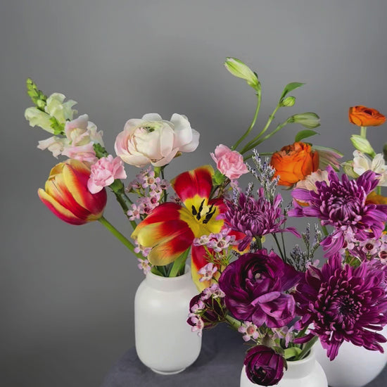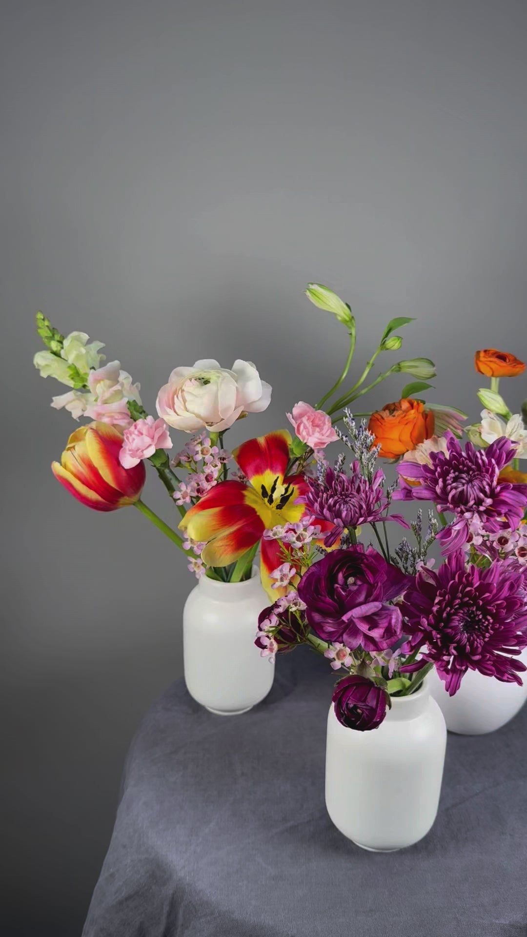 A set of three ceramic bud vases (5" high), each filled with a unique mix of fresh, seasonal flowers in a florist’s choice color palette. Perfect to bring beauty around your home, gifting individually, or displaying together as a cheerful trio. If you have a preferred color palette, feel free to mention it in the “Order special instructions” — we’ll do our best to accommodate.