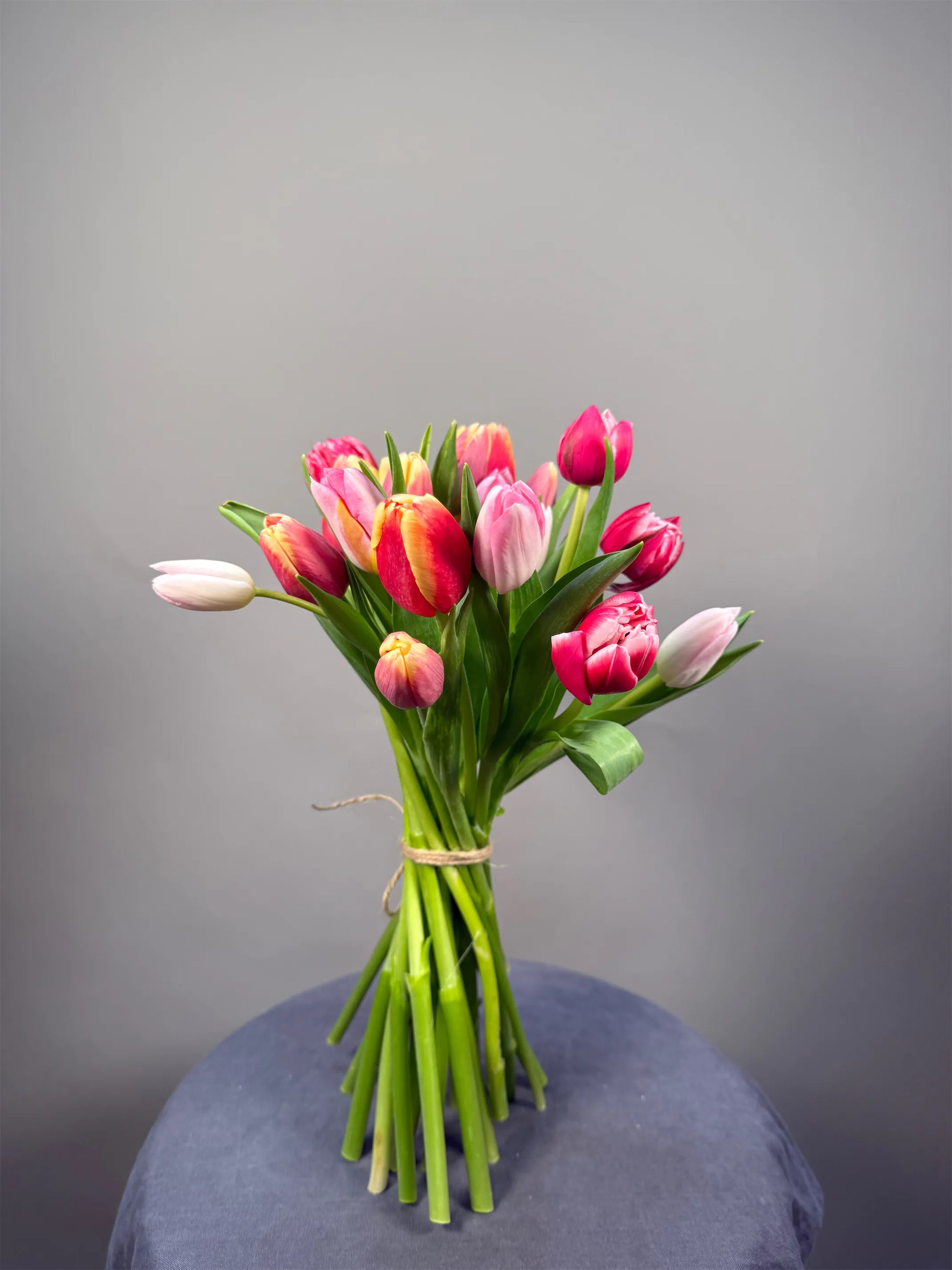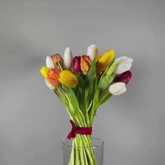 A joyful burst of color, this bouquet of vibrant tulips is perfect for brightening someone’s day. These tulips make a beautiful gift for any occasion.